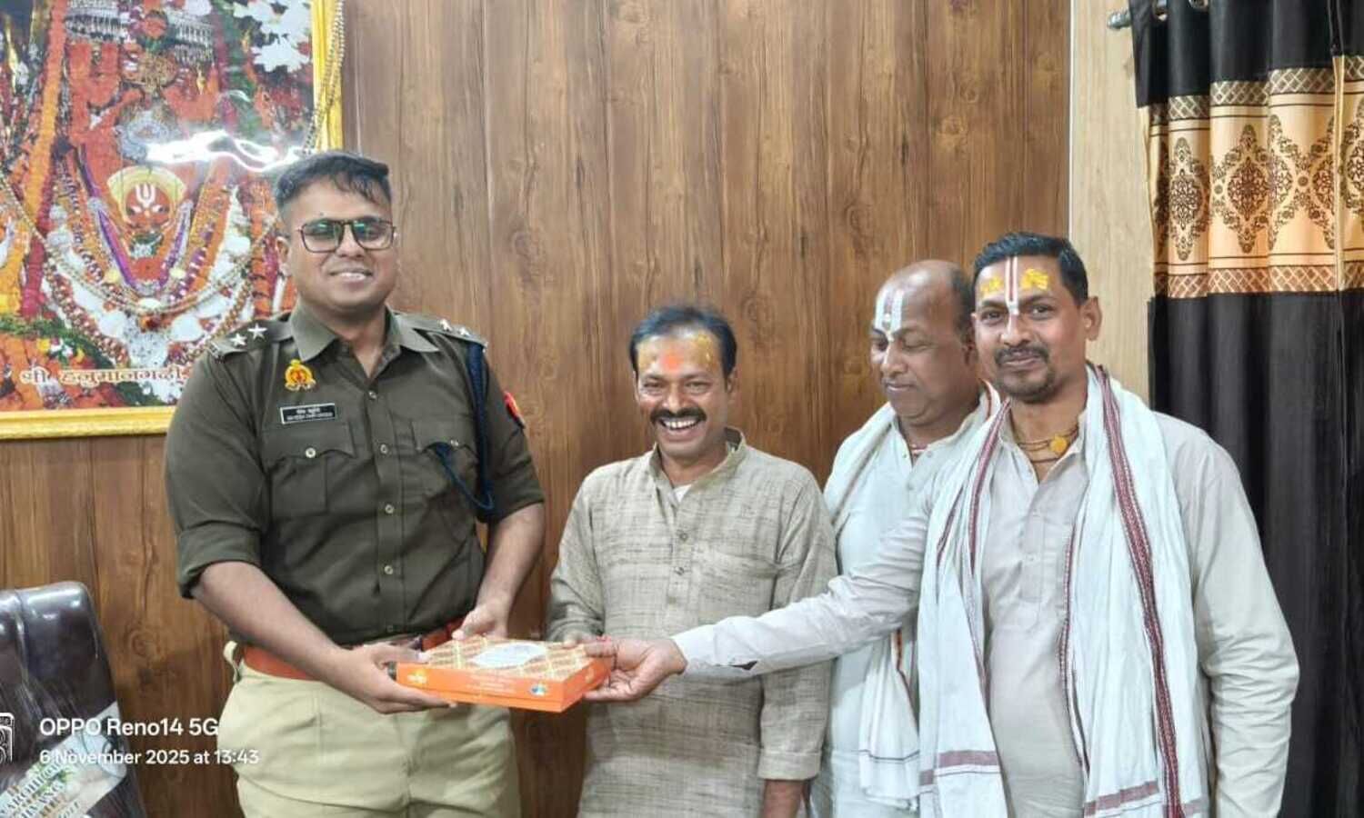 अयोध्या। श्री रामनगरी अयोध्या में ऐतिहासिक कार्तिक पूर्णिमा और परिक्रमा मेला सकुशल संपन्न होने पर तीर्थ पुरोहित समाज सेवा ट्रस्ट के अध्यक्ष दुर्गेश महाराज, पंडा समाज के नवनिर्वाचित अध्यक्ष ओमप्रकाश पांडे, तथा लड्डू गोपाल सेवा ट्रस्ट के अध्यक्ष प्रदीप महाराज सहित पुरोहित समाज के पदाधिकारियों ने क्षेत्राधिकारी अयोध्या देवेश चतुर्वेदी का अभिनंदन एवं सम्मान किया गया।