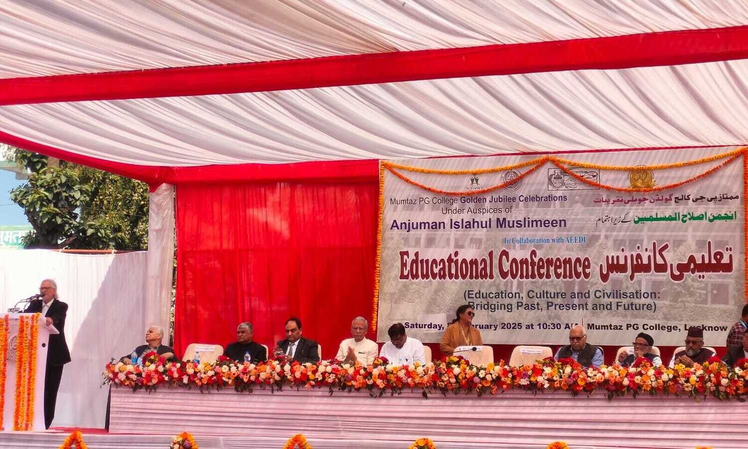 कालेज संचालक संस्था अंजुमन इस्लाहुल मुस्लमीन के संयोजन में एईईडीयू के सहयोग से ‘शिक्षा संस्कृति और सभ्यता : अतीत वर्तमान और भविष्य के बीच सेतुबंध’ विषय पर आयोजित सम्मेलन में श्री डा.कुरैशी ने कहा कि आंकड़ों के नजरिये से देखा जाये तो राष्ट्रीय साक्षरता दर 71 फीसदी है और मुसलमानों की साक्षरता 57 फीसदी ही है, जबकि ईसाई 75 प्रतिशत और बौद्धों की साक्षरता दर 71 प्रतिशत है। अपनी किताब ‘पापुलेशन मिथ.....’ उन्होंने कहा कि हम मानते हैं कि पढ़ी-लिखी लड़की का खानदान अनपढ़ नहीं हो सकता फिर भी मुस्लिम पुरुष साक्षरता 67 फीसदी है तो महिलाओं की केवल 50 फीसदी। उन्होंने उम्मीद जतायी कि एईईडीयू के साथ इस कालेज को लेते हुए हम स्टडी सेण्टर खोलने के बाद हम और आयामों पर भी काम करेंगे और आगे बढ़ेंगे। इससे पहले अंजुमन सचिव व कालेज प्रबंधक सैयद अतहर नबी एडवोकेट ने अतिथियों का स्वागत करते हुये आयोजन को गर्व का विषय बताते हुए कहा कि अंजुमन की निगरानी में संचालित शिक्षण संस्थानों ने बहुत तरक्की की है और यह संस्थान मील का पत्थर है। नई शिक्षा नीति को संस्कारों, रोजगार और करियर बनाने की दृष्टि से नये आयाम खोलने वाली बताते हुये उन्होंने कहा कि अब स्टडी सेण्टर उद्घाटित होने के बाद कालेज के गोल्डेन जुबली पर आगे खेलकूद, बैतबाजी, कव्वाली, ड्रामा वगैरह के आयोजन भी किये जायेंगे। अलीगढ़़ मुस्लिम यूनिवर्सिटी के पूर्व कुलपति जमीरुद््दीन शाह ने कहा कि हमें अंग्रेजी भाषा, सूचना प्रौद्योगिकी के संग अब आर्टिफीशियल इंटेलीजेंस की तालीम पर ध्यान देना होगा। अगर इसमें पिछड़ गये तो भरपाई मुश्किल है। कौम और मुल्क की तरफ तवज्जो देते हुये अगर हम तब्दीली चाहते हैं तो इल्म और बुनियानी शिक्षा पर ध्यान देना ही होगा। तीन सर सैयद नेशनल स्कूल खोलने का जिक्र करते हुए उन्होंने कहा कि ऐसे स्कूल हर जिले में खुलने चाहिए। स्वर्ण जयंती की बधाई देते हुए उन्होंने कहा कि मुमताज कालेज को नौकरी या उद्यम के लिये तैयार छात्र निकालने चाहिए और अपने को सेंट स्टीफन जैसा ब्राण्ड बनाना चाहिए।