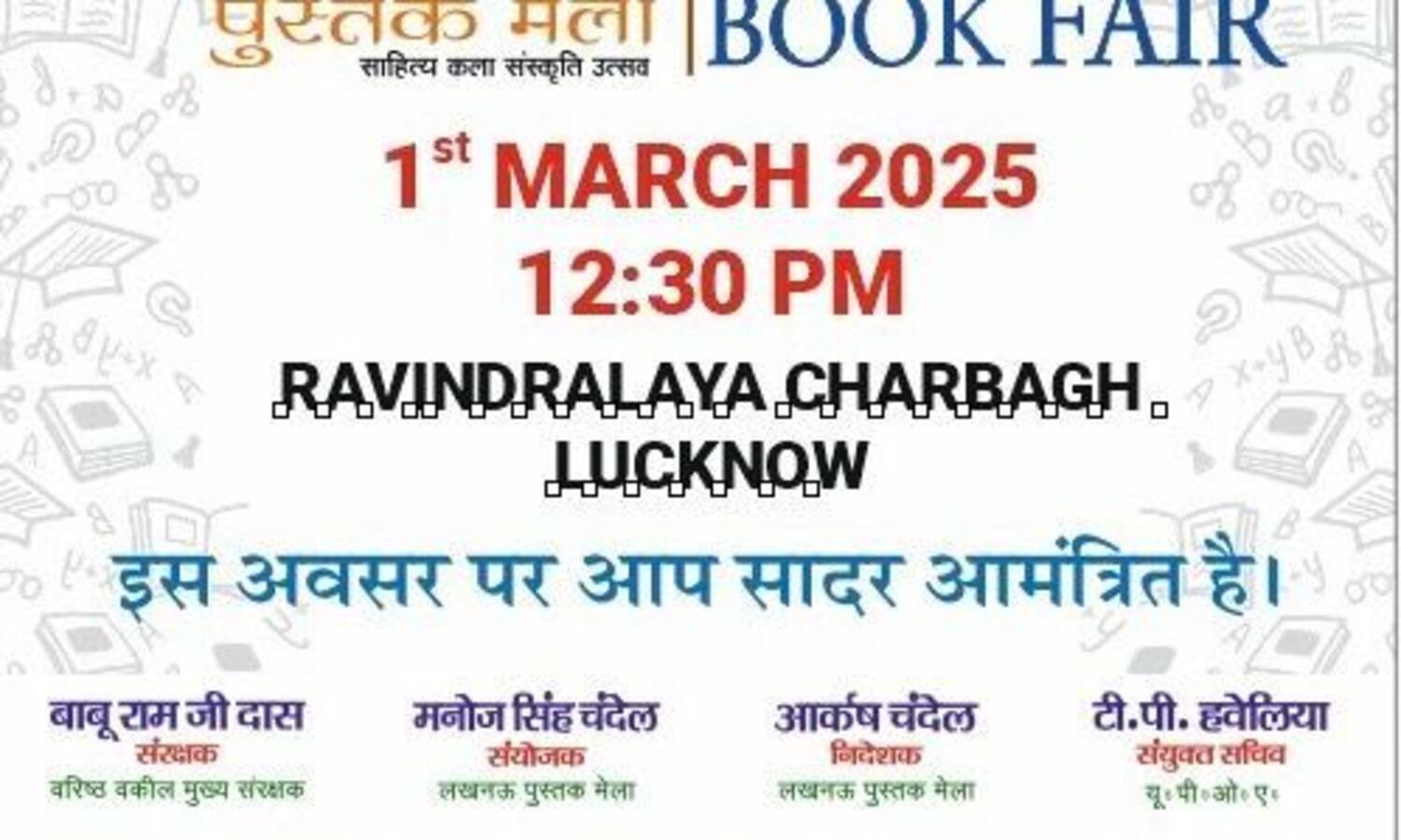 लखनऊ, 28 फरवरी। रवीन्द्रालय चारबाग लान में कल पहली मार्च से लखनऊ पुस्तक मेला प्रारम्भ हो जायेगा। बाल साहित्य थीम पर आधारित मेले का उद्घाटन दोपहर साढ़े 12 बजे होगा। नौ मार्च तक रोज़ सुबह 11 से रात नौ बजे तक मुफ़्त प्रवेश वाले किताबों के इस मेले में लोकआंगन और ज्वाइन हैण्ड्स फाउण्डेशन एक से पांच मार्च तक नृत्य नाट्य संगीत समारोह भी आयोजित करा रहा है।