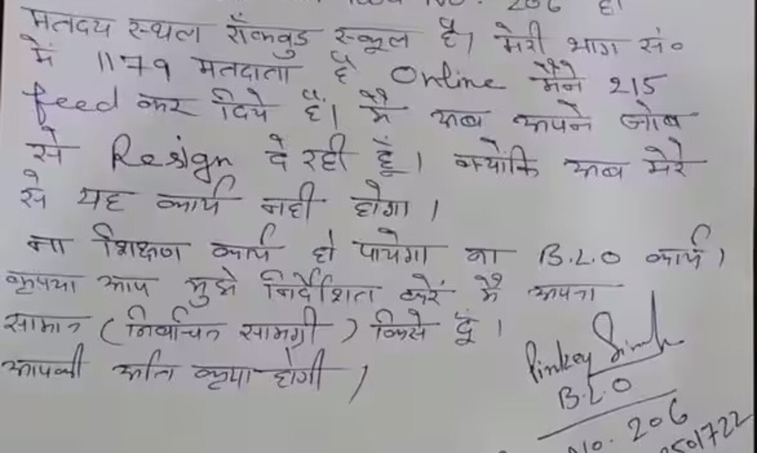 महिला अध्यापिका पिंकी सिंह के वायरल हुए इस्तीफे पत्र में लिखा है, 'मेरा बीएलओ का पार्ट नंबर 206 है. मतदाता स्थल रॉकवुड स्कूल है. मेरे भाग संख्या में 1179 मतदाता हैं. मैंने 215 मतदाताओं का ऑफलाइन डेटा फीड कर दिया है. मैं अब अपने जॉब से इस्तीफा दे रही हूं, क्योंकि अब मुझसे यह काम नहीं हो पाएगा.'
