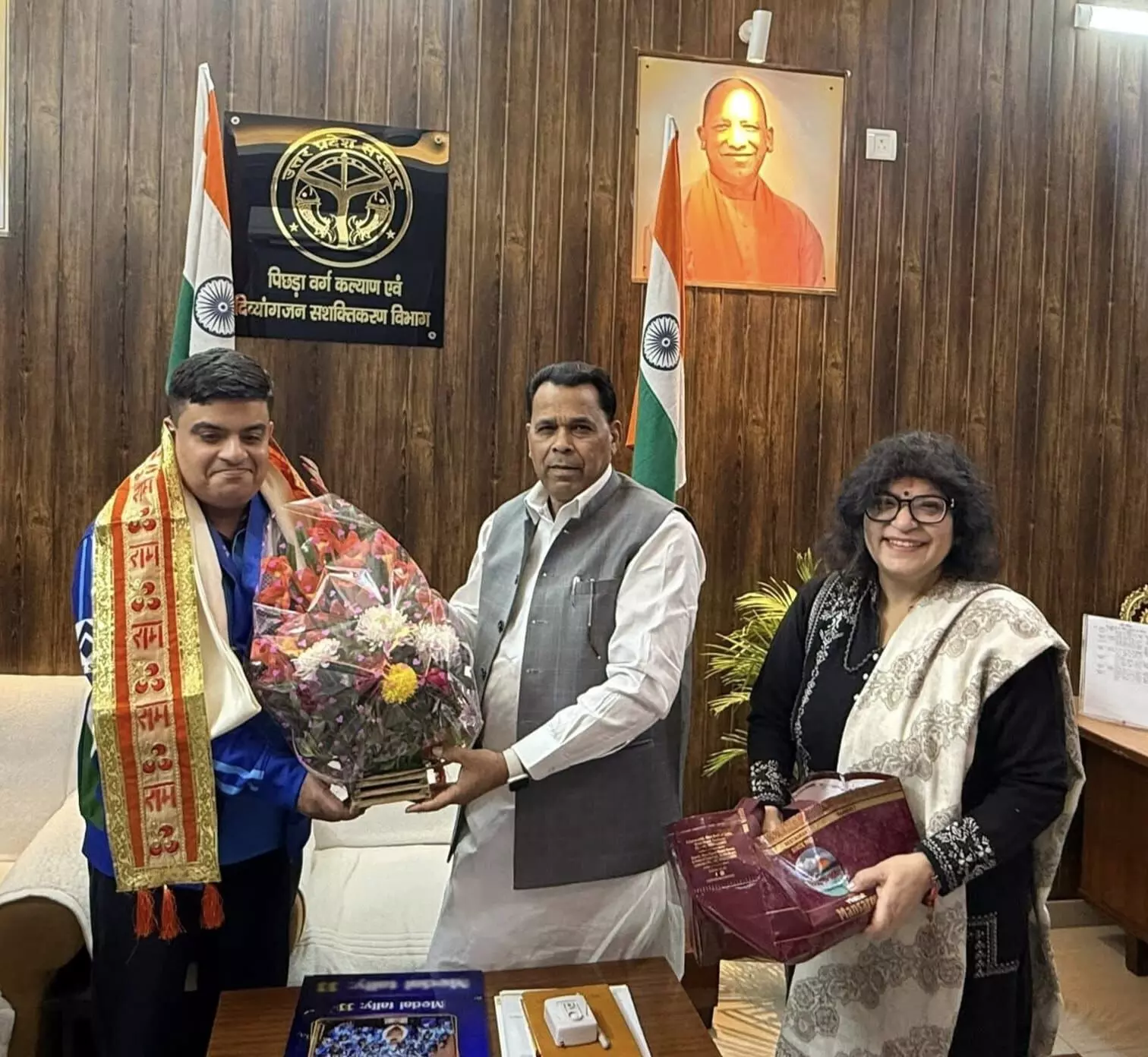 स्पेशल ओलंपिक में अंतरराष्ट्रीय स्तर पर देश और प्रदेश का नाम रोशन करने वाले 32 वर्षीय दिव्यांग खिलाड़ी वासु तिवारी को रविवार को पिछड़ा वर्ग कल्याण एवं दिव्यांगजन सशक्तिकरण राज्यमंत्री (स्वतंत्र प्रभार) नरेंद्र कश्यप ने अपने लखनऊ स्थित आवास पर मेडल पहनाकर सम्मानित किया। इस अवसर पर मंत्री कश्यप ने वासु की उपलब्धियों की सराहना करते हुए उनका उत्साहवर्धन किया और भविष्य में हरसंभव सहयोग का आश्वासन दिया।