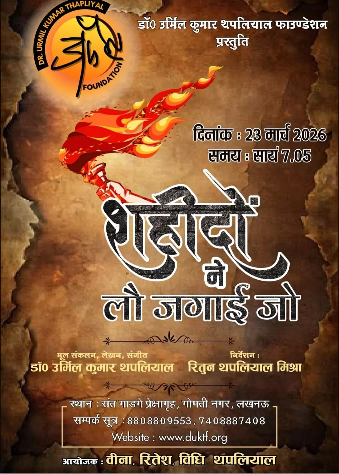 अमर शहीद भगत सिंह के बलिदान दिवस के अवसर पर 23 मार्च की शाम एक विशेष संगीतमय नाटक ‘शहीदों ने लौ जगायी जो’ का मंचन किया जाएगा। यह आयोजन डॉ. उर्मिलकुमार थपलियाल फाउंडेशन द्वारा किया जा रहा है।