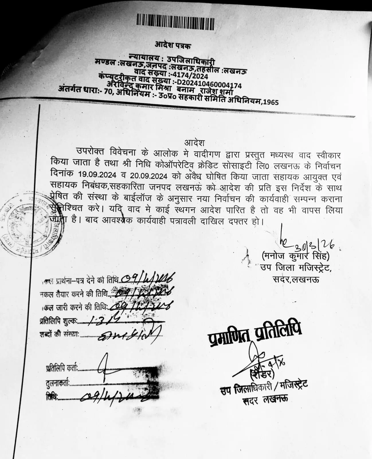 श्री निधि कोआपरेटिव क्रेडिट सोसाइटी लिमिटेड लखनऊ का निर्वाचन उप-जिला मजिस्ट्रेट, सदर, लखनऊ ने अवैध घोषित करते हुए फिर से चुनाव कराने का फैसला दिया है।
