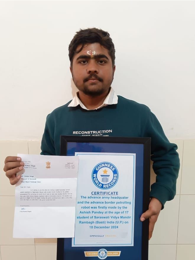 प्रयाग विश्वविद्यालय में संपन्न होने वाले गिनीज बुक आफ वर्ल्ड रिकॉर्ड टेक मैराथन कंपटीशन 2024 कार्यक्रम में सरस्वती विद्या मंदिर वरिष्ठ माध्यमिक विद्यालय रामबाग बस्ती (यू. पी.) के आशीष पांडेय ने अग्रिम सेना मुख्यालय और अग्रिम सीमा पेट्रोलिंग रोबोट को सबसे पहले 17 साल की उम्र में बनाकर गिनीज बुक ऑफ़ वर्ल्ड रिकॉर्ड में अपना स्थान बनाया है।