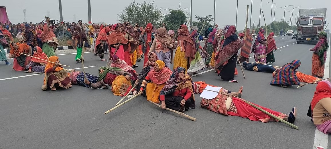 आगरा : इनर रिंग रोड पर किसानों का धरना जारी, मार्ग पर लेट गईं महिलाएं...लगा दिया जाम; मौके पर पुलिस तैनात