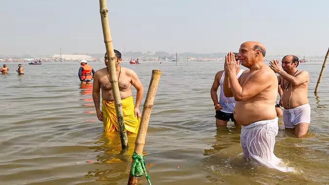 रक्षा मंत्री राजनाथ सिंह और राज्य सभा सांसद सुधांशु त्रिवेदी ने पवित्र त्रिवेणी संगम में स्नान किया। मंत्रोच्चार के बीच उन्होंने मां गंगा के जल का आचमन कर भगवान सूर्य को अर्घ्य दिया और राष्ट्र की मंगलकामना की। रक्षा मंत्री राजनाथ सिंह ने कहा, मैं इसे अपना सौभाग्य मानता हूं कि आज प्रयागराज, संगम में मैंने स्नान किया। यह भारतीयता का आध्यात्मिक व सांस्कृतिक महापर्व है। किसी पंथ, समुदाय या धर्म के साथ इसे जोड़कर नहीं देखा जाना चाहिए। किसी को यदि भारत और भारतीयता को समझना है तो आकर महाकुंभ को देखिए।