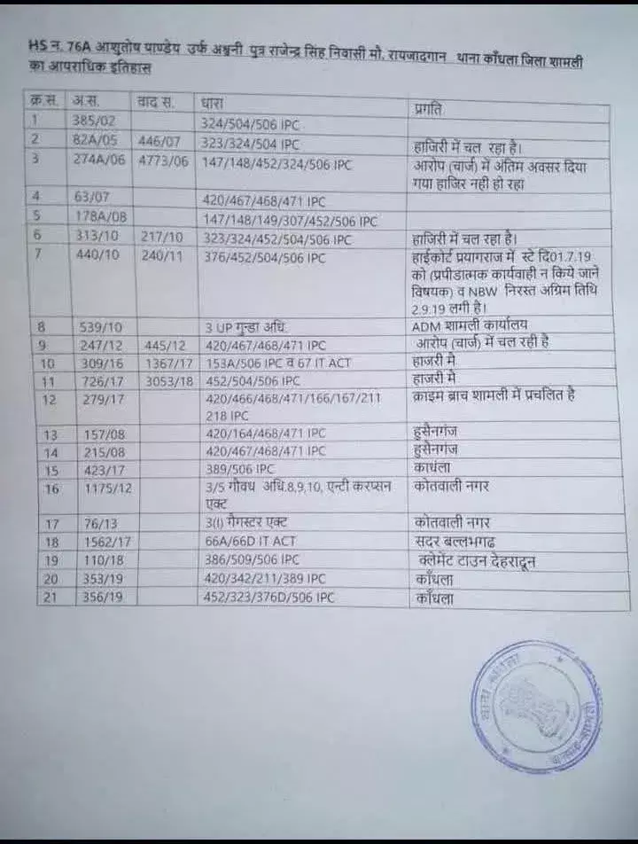 इस बयान के बाद राजनीतिक गलियारों में पुलिस रिकॉर्ड के पन्ने खंगाले जाने लगे. इस बीच पुलिस रिकॉर्ड की जांच में सामने आया कि आशुतोष ब्रह्मचारी उर्फ आशुतोष पांडेय उर्फ अश्वनी सिंह का अपराध रिकॉर्ड काफी लंबा है. शामली जिले के कांधला थाने में उनकी हिस्ट्रीशीट नंबर 76A दर्ज है. उनके खिलाफ लगभग दो दर्जन से अधिक मुकदमे दर्ज बताए जाते हैं, जो शामली, गोंडा, मुजफ्फरनगर और लखनऊ जैसे जिलों में दर्ज हैं.