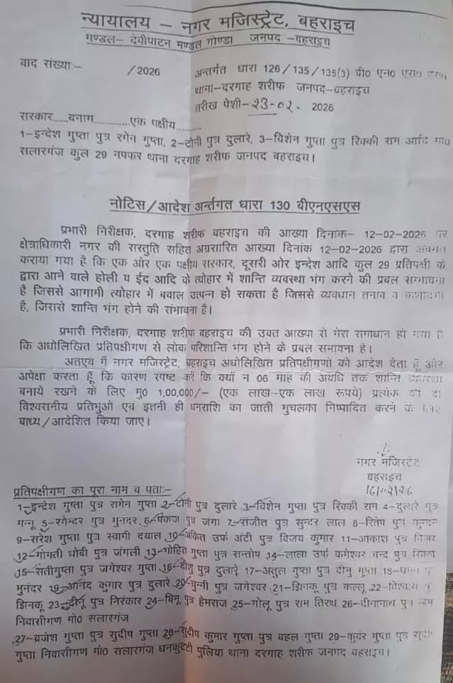 बहराइच: होली पर्व से पूर्व एक पक्षीय पुलिस रिपोर्ट के आधार पर नगर मजिस्ट्रेट द्वारा हिंदू समाज के लोगों के विरुद्ध शांति भंग की कार्यवाही किए जाने को लेकर क्षेत्र में भारी आक्रोश फैल गया है। जानकारी के अनुसार प्रशासन ने सभासद सहित कुल 29 लोगों को चिन्हित कर उनके खिलाफ धारा 126/135 के तहत नोटिस जारी किए हैं।