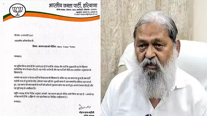 पिछले दिनों हरियाणा के मंत्री अनिल विज की ओर से मुख्यमंत्री नायब सिंह सैनी और प्रदेश अध्यक्ष मोहन लाल बड़ौली को दिए सार्वजनिक बयानों को भाजपा ने गंभीरता से लिया है। पार्टी अध्यक्ष मोहन लाल बड़ौली ने अनिल विज को कारण बताओ नोटिस जारी कर तीन दिन में जवाब मांगा है।